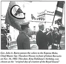 Col Judd stood up the unit with Chief Master Sgt Theodore Hussey as the first Kapena Moku overseeing a single squad of 14 men, receiving the unit colors from Governor John A. Burns at Iolani Palace on 16 November, 1963. The date was chosen to coincide with King Kalākaua's birthday, where they stand a ceremonial guard at the Palace during the annual celebrations.[1][16]