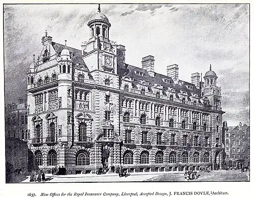 The building was constructed between 1896 and 1903 as the head office of the Royal Insurance Company (since 1996 part of the RSA Insurance Group). The design was the result of a competition won by James F. Doyle in 1895. The assessor for the competition was Norman Shaw, who was retained as an advisory architect for the project, but it is uncertain what part he played in it.[1] The building is constructed around a steel frame and is the earliest example of this type of construction in the United Kingdom.[1][2] It ceased to be used by the late 1980s, and its condition deteriorated so much that it was placed on the Buildings at Risk Register of English Heritage.[3]