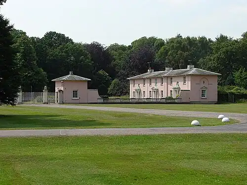 Royal Lodge is a Grade II listed house in Windsor Great Park in Berkshire, England, half a mile north of Cumberland Lodge and 3.2 miles (5.1 km) south of Windsor Castle.[1] The site of homes since the 17th century, the present structure dates from the 19th century, and was expanded in the 1930s for the then Duke of York, the future King George VI. Its central section consists of three storeys, with two-storey wings, totalling about 30 rooms, including seven bedrooms. The Royal Chapel of All Saints was built on the grounds in the 1820s.