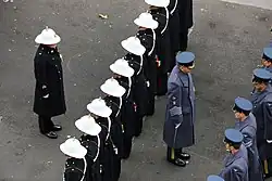 The Royal Marines Band Service is the only element of the Corps of Royal Marines to wear Number 1 Full Dress based on the Royal Marines Dress Uniform worn from 1922 to 1939.[13] The simpler Number 1A dress or "blues" are worn by other Royal Marine units on ceremonial duties. Full Dress consists of a royal blue single-breasted tunic with red facings (with gold piping) and yellow cuff slashes. Royal blue trousers with a scarlet stripe and a white "Wolseley pattern" pith helmet are also worn. The helmet's decoration includes a brass ball ornament at the top (a detail inherited from the Royal Marine Artillery), helmet plate and chin chain. Buglers wear dress cords and also have thinner trouser stripes to indicate their status.