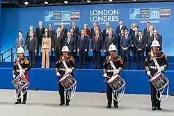 The Corps of Drums from the Band of HM Royal Marines Collingwood performing a drum display during the 2019 London summit.