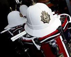 Wolseley pattern helmet and side drums of the Royal Marines Band Service.