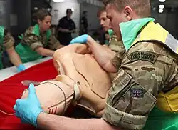 Members of the Royal Marines Band Service during medical training. Also visible is the "Royal Marines Band Service" badge worn in place of the "Royal Marines Commando" flash, on the shoulder.