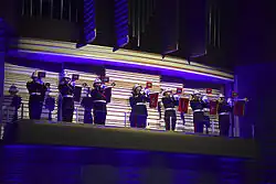 The Royal Marines Band Service is the musical wing of the Royal Navy and an independent element of the Royal Marines. It currently consists of five bands plus a training wing – the Royal Marines School of Music at HMS Nelson – and its headquarters is at HMS Excellent, Whale Island, Portsmouth.