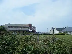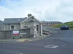 With naval use of the harbour continuing to increase, plans were drawn up in 1901 for a new general hospital to be built at Castle Road (on higher ground directly south of the sick quarters). Completed by 1906, it was made up of an officers' block, administration block, kitchen, surgical block and medical block all linked by a covered walkway.[5] The nearby buildings of the R.N. Sick Quarters were converted or rebuilt to provide staff accommodation (and other ancillary facilities). Portland Hospital Halt, an un-timetabled station on the Easton and Church Hope Railway, provided railway access to the site.[6] Once the new hospital was open the old hospital buildings in the dockyard were converted into torpedo workshops.[3]