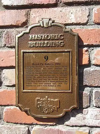 When the bakery was first built, it was known as the San Diego Steam Cracker Factory, and made crackers for use on ships travelling from the Port of San Diego.[2] In 1899 the building was sold to J. Millender, who leased it to a series of bakers whilst using the upper storeys of the building as residential or hotel rooms.[2] The building was sold again in 1920 to Alois Kuhnel and Francis Smith, who ran the Royal Pie Bakery.[3] When Alois Kuhnel died the bakery was taken over by his son, Alex Kuhnel, who ran the bakery as a trade supplier.[4] The bakery closed in 1998 when Alex Kuhnel died, and the building now hosts an Irish pub and restaurant.[2]