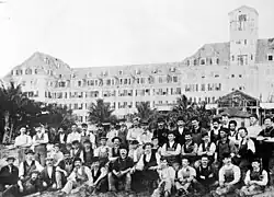 Ground was broken on May 1, 1893.[2] According to the Historical Society of Palm Beach County, the construction of the Royal Poinciana Hotel required approximately 1,000 workers and "1,400 kegs of nails, 360,000 shingles, 500,000 bricks, 500,000 feet [150,000 meters] of lumber, 2,400 gallons [9,085 litres] of paint, 4,000 barrels of lime, 1,200 windows, and 1,800 doors, among other materials".[4] Also on that day, Elisha Newton "Cap" Dimick, Uriah D. Hendrickson, and Edmund M. and John H. Brelsford founded the Dade County State Bank, the area's first bank, located near the Lake Worth Lagoon and just south of the modern-day Royal Poinciana Way.[5][6] Flagler used this bank to monetarily compensate the workforce constructing the Royal Poinciana Hotel. Additionally, Flagler initially leased the entirety of the Cocoanut Grove House as a means of providing residential quarters for the construction workers. However, a fire destroyed the Cocoanut Grove House in October 1893.[7] Consequently, two camps then sprang up, one for white workers at the present-day site of Seaview Avenue and another for black workers, called "the Styx", where Sunset and Sunrise avenues intersect North County Road today.[8]