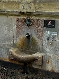The Harrogate Improvement Commissioners Board's 1841 Harrogate Act established the principle that the poor should not be excluded from the perceived medicinal benefits of Harrogate's sulphur water. In order to conform to the act the Pump Room provided an outside tap which anyone could use at any time. After 9.30 am the Pump Room's attendants stopped serving well water inside the building. From this time onward the outside tap was the only source of well water. In the early days of the building an attendant supervised the tap.[14] This tap still exists today and it still works, although it is not recommended to try the water, due to the health risks involved.[12]