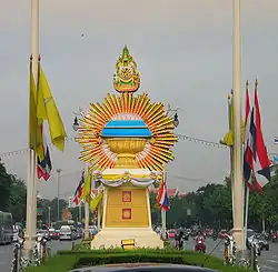 The royal staff or Than Phra Kon (Thai: ธารพระกร) is one of the five royal regalia[1] of the King of Thailand. The staff is made of cassia wood and enclosed at both ends in gold. It has a length of 118 cm (46 in). One end has a knob and there are three tines at the foot. The royal staff is used as a symbol of regal authority as in other cultures around the world, and is associated in Thailand with the guiding of the king's footsteps down the path of justice and equity.