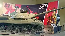 The collection includes tanks from both Eastern and Western countries, acquired through gifts or military exchange programs. The tanks are categorized by their origin, with those from Western NATO countries grouped together and those from Eastern Warsaw Pact countries classified separately. Notable examples in the collection include the Soviet Iosif Stalin III, BMP-1, PT-76, T-34, T-54, T-64, and T-72 tanks, as well as the American M22 Locust and M41 tanks, along with the M36 and M50 Ontos tank destroyers. Additionally, the British Chieftain, Conqueror, and Comet tanks are prominently featured.[50]