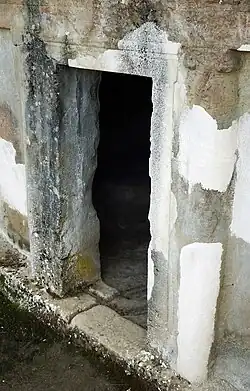 This tomb is on two levels. The upper level is a rock cut exedra as an Ionic hemicycle, with eight pilasters whose capitals were made separately flanking the entrance. To the left there is a niche with a relief engraved with a Bucranium and a helmet of the Pergamene type. To the right is a relief of an Illyrian-Macedonian shield. The floor of the tomb had a mosaic, but nothing of this remains. The door, which would have been sealed, leads to a narrow chamber. Gilkes[6] considers that this chamber may have been abandoned due to the irregularity of the rock, and that the chamber below may have been cut as a result. A fault in the rock, and rough pick marks, are visible. The second chamber has a high barrel vault and contained two beautifully carved sarcophagi in the form of couches. 10 burials were recovered from this chamber, some in the sarcophagi and others in the floor. A second burial period is attested. These date to the last decades of the 3rd century and produced many grave goods, now on display in Tirana. Some scholars believe that this may have been the tomb of a royal family or dynasty. Among the grave goods are golden earrings, necklaces, pins, rings, all of the Hellenistic type, belt fittings, iron, a silver ornament depicting a battle scene, armour, spear points and 30 ceramic vessels.[7]