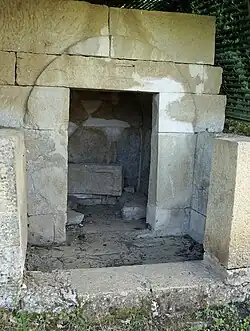 The last tomb has the shape of a Macedonian built tomb and consists of an antechamber and the actual burial chamber, both covered and built in ashlar construction. A stone slab with relief serves as a false door to the grave chamber. In the chamber itself are the remains of three sarcophagi in the form of klinai, built of upright stone blocks. They were used primarily for body burials. Later, urns and grave goods were laid in the sarcophagus. The tomb was robbed in antiquity.