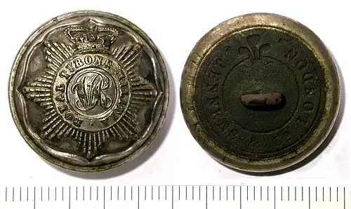 Royal Tyrone Militia button; with the 'VR' cypher it must date between 1837 and 1855 when the Fusiliers title was granted. Excavated in Surrey (Portable Antiquities Scheme, FindID 202506).