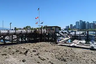 The Royal Vancouver Yacht Club (RVYC) is a yacht club located in Vancouver, British Columbia. Royal Vancouver Yacht Club currently operates two marinas, the one at Jericho Beach in English Bay and another in Coal Harbour. The Jericho site includes a clubhouse, two restaurants, and berths enough for 350 as well as a dinghy dock. In 2017 the award-winning Dock Building was completed, designed by Michael Green Architecture, providing offices for the Harbour Master, instruction and amenity space and workshops to maintain boats, sails, and gear.[1] The Coal Harbour site has approximately 350 berths, some with covered moorage, and is the location of the floating restaurant called The Mermaid Inn.[2] The club also has seven offshore stations in BC waters.