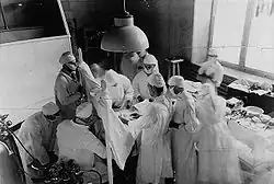 Surgeons Norman Bethune, Arthur Vineberg and Perron assisting Edward William Archibald in an operation, 1933