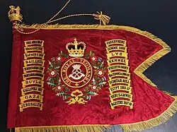 As a result of the Regiment's initial service during the Iraq war, in 2005 the Royal Yeomanry was awarded the battle honour "Iraq 2003".[43] This is the first such honour the regiment has won since its formation, and the first battle honour awarded to an Army Reserve regiment since the Second World War.[28] The honour is carried on the regiment's guidon. The guidon, presented to the regiment on 7 May 2016, additionally bears 40 of the battle honours won by its antecedent regiments. As well as these, the guidon also carries an artillery badge as a distinction, and four theatre honours awarded to those of its antecedents that were converted to artillery during the Second World War.[44]