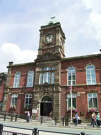 The new building, which was designed in the Victorian style, was built in red brick with stone dressings at a cost of £7,000 and was officially opened by the first chairman of local board of health, James Ashworth, in September 1880.[3][4] The design involved a symmetrical main frontage with five bays facing onto Rochdale Road; the central bay, which was built of stone and slightly projected forward, featured a round headed doorway on the ground floor flanked by pilasters supporting an entablature bearing the town's coat of arms; there was an eight-light window on the first floor and a pediment above with a clock tower at roof level. The other bays contained mullion windows on the ground floor and round headed windows on the first floor. The clock, which was designed and manufactured by Gillett and Bland,[5] and the bell were a gift from Dr and Mrs John Kershaw,[6] who also financed the local cottage hospital.[7][8]