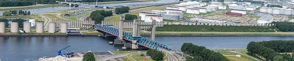 Rozenburg wind wall in Rozenburg, Netherlands, is a wall built to block wind from entering the Calandkanaal, and ease the passage of large cargo ships through the narrow canal, particularly through the Calandbrug. The wall blocks about 75% of the wind and allows the ships to pass smoothly. The wall is 1600 meters long and it is made up of 125 rectangular and cylindrical slabs, each about 25 meters tall and 18 meters wide.[1]