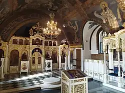 During the 1925 reconstruction, two statues were sculptured. One represents the lancer from the period of Emperor Dušan, while the other one is of an infantry soldier from the Balkan Wars period.[4] The statues are placed on the sides of the main entrance. The white, memorial plaque was placed above the statue of the medieval knight.[6] Krasnov especially designed the side portal where these statues are placed, so as the bronze icon of the Mother of God. The two sculptures were also made of remaining war materials.[7] Six icons were brought from the Serbian military camp in Nador, Morocco, but only two are preserved today. The iconostasis was carved by Kosta Todorović, and the icons were painted by Rafailo Momčilović. The walls were covered in paintings by Andrej Bicenko, another Russian émigré artist, who finished his work in 1938.[4]