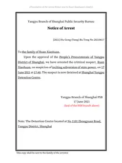 - ^ a b Notice of Arrest, cite as: [2021] Hu Gong (Yang) Bu Tong No 20210617, Shanghai: Yangpu Branch of Shanghai Public Security Bureau, 17 June 2021.