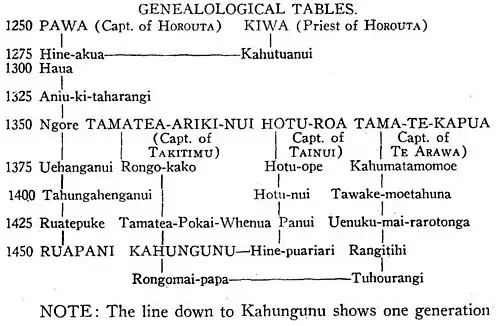 - the first image[2] showing his descent from Pawa, the captain of the Horouta waka and Kiwa, priest of the Horouta, who is also known as the navigator.[3]