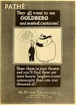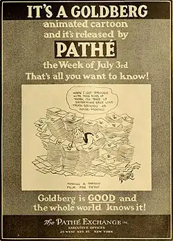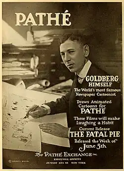 In 1916, Goldberg created a series of seven short animated films which focus on humorous aspects of everyday situations[12] in the form of an animated newsreel.[13] The seven films were released on these dates in 1916: May 8, The Boob Weekly; May 22, Leap Year; June 5, The Fatal Pie; Jun 19, From Kitchen Mechanic to Movie Star; July 3, Nutty News; July 17, Home Sweet Home; July 31, Losing Weight.[14]