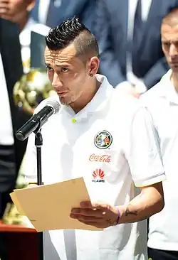 On 30 May 2012 it was confirmed that Sambueza was transferred to América, reuniting him with his former manager whilst at Estudiantes Tecos, Miguel Herrera.[9][10][11] His first match with Las Águilas came on 28 July 2012 in a 4–2 win over Jaguares at the Estadio Azteca.[12] He scored his first goal a week later in a 2–2 draw against Atlante.[13] He scored the following two matches against Atlas[14] and Querétaro[15] in a 1–1 draw and 4–0 win, respectively. He finished his first season with América playing 16 matches, scoring four goals and having three assists. In only his first tournament at the club, Sambueza was named the club's best midfielder by the fans in a social media poll, receiving 50.75% of the votes, ahead of captain Daniel Montenegro.[16]