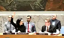 During her tenure, she notably represented India in the UN Security Council[38] from August to December 2022, achieving the unique distinction of becoming the first Indian woman[39][40] to preside over the Security Council in December 2022.