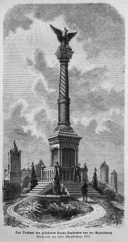 In 1872, the first monument erected by members of the students’ corps was unveiled. The Gefallenensäule (English: Pillar to the Fallen) was established in honour of those members who had fallen in the Franco-Prussian War. The Emperor William I Obelisk was unveiled in 1890, followed in 1896 by the Young Bismarck Memorial. The last of this first round of monuments was erected in 1926 in honour of those who fell in World War I.