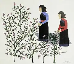 Rufina Vigil, also called Sah Wa,[1] was an Puebloan-American painter from the Tesuque Pueblo tribe, part of the Eight Northern Pueblos.[2] Active in the 1930s,[3] she studied under Dorothy Dunn at the Santa Fe Indian School. At one time she worked as a drafter in Los Alamos, New Mexico.[2] Vigil's paintings depict Tesuque life, including women gathering guaco and firing pottery.[3] Her 1936 painting Mass at Fiesta is one of the earliest depictions of Catholic Church rituals by an indigenous North American painter.[4]