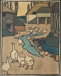 A quiet village of stacked, blocky houses in soft tones sets the backdrop as a cleanly outlined flock of geese crosses a cobbled lane. Graphic and minimal, the piece blends rural charm with modernist structure and illustrative simplicity.