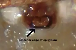 Female distinguishing characteristics: The paired openings of the epigynum (epigyne) are nearly merged into a single oval opening, with a variable median divider extending in from the anterior side, giving the impression of a rounded ‘B’ lying on its back.