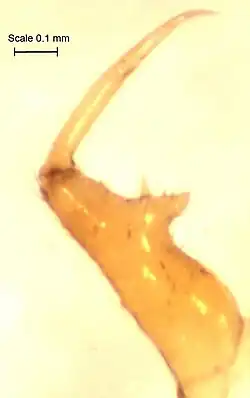 Male distinguishing characteristics: The chelicerae (fangs) are enlarged with a very distinctive shape, as shown in the photograph.