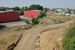 Work was begun in August 2007, nearly ten years after public consultation began. After months of building temporary service routes, major earthworking started in May 2008 along the southern section of the road. By the start of September that year tarmac was starting to be laid on this section and earthworking was starting elsewhere.[11] For the rest of the year the roundabout at the south end of the road, along with strengthening of existing bridges started. In January 2009 industrial contaminants were found on a part of the proposed route on land formerly owned by Cemex, one of whose plants are next to the road. These however were quickly identified and removed.[12] In March 2009 a roundabout was completed on the A4071 which takes drivers off it and onto the Relief Road. During construction local school children and interested members of the public were able to have planned visits to the site.[13]