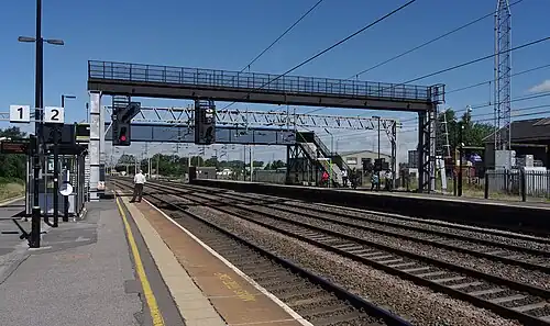Rugeley Trent Valley has three platforms with Platform 3 located at the main entrance and Platforms 1 and 2 located on an island platform. Platform 1 is bi-directional, which is used for terminating services from Birmingham New Street where as Platform 2 is used for northbound services to Crewe, while Platform 3 is used for southbound services to London Euston. Between Platforms 2 and 3, there are two fast lines for non-stop services. All platforms are electrified.