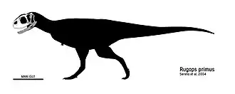 Rugops (meaning 'wrinkle face') is a monospecific genus of basal abelisaurid theropod dinosaur that lived during the Late Cretaceous period (Cenomanian stage, approximately 95 million years ago) in what is now the Echkar Formation in Niger. The type and only species, Rugops primus, is known only from a partial skull. It was named and described in 2004 by Paul Sereno, Jeffery Wilson and Jack Conrad. Rugops has an estimated length of 4.4–5.3 metres (14–17 ft) and weight of 410 kilograms (900 lb). The top of its skull bears several pits which correlates with overlaying scale and the front of the snout would have had an armour-like dermis.