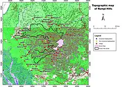The Northern boundary is the road from Lipenja Mukete through Ikoi and Dikome Ngolo to Madie. The Southern boundary goes through Nalende, Monyange, Itoki and Ilor to Moko. Meanwhile, the Eastern boundary goes through Dikome Balue, Mofako, Itende to Bisoro. Finally, the West boundary goes through Dibonda and Ndian and Ituka to Lipenja which is also the starting point of the reserve.[5] These boundaries give the Rumpi Hills Forest Reserve a horse-shoe shape.