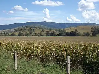The terrain is generally hilly with elevations rising in the south to well above 600 metres along the McPherson Range. It covers the area roughly equivalent to the catchment formed by Running Creek, with the exception of its most upper parts which lie in Mount Gipps and Southern Lamington. Running Creek, itself a tributary of the Logan River, has a number of tributaries including New Year Creek and Camp Creek. Vegetation has been cleared in many parts for primary production purposes.[17]