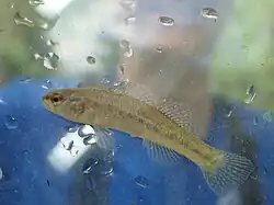 This fish measures about 5 centimetres (2.0 in) in length. It is similar to its relative, the goldstripe darter (Etheostoma parvipinne), but with paler coloration.[3][4] This species is brownish in color[5] and they frequently show orange or red markings in the eyes.[6] They have a lifespan of 2–3 years.[5]