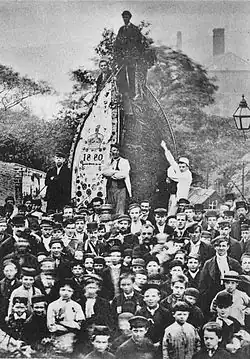 In the 18th century the ceremony usually formed part of the annual feast or wake, held on the Sunday closest to the feast day of the saint to which the church was dedicated.[9] The rushes were brought to the church in a procession, accompanied by music and Morris dancing. In some areas the rushes were carried in individual bundles and in others on a rushcart. Where a rushcart was used it became the main focus and was decorated with garlands and flowers,[10] tinsel, and 'all the silver plate that can be borrowed in the neighbourhood'.[11] When the procession reached the parish church the rushes were strewn on the floor and the garlands used to adorn the church.[12][13] It is not known how long rushcarts have been a feature of the festivities, but an account by the Hon. H. Egerton from 1726 implies that the one he saw in use in Prestwich was of long standing.[14]