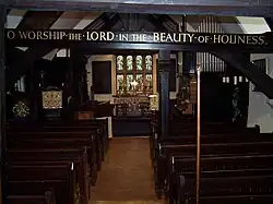 The existing building, which is Grade II* listed, has medieval timber-framing and was rebuilt in sandstone in the 17th century. It has a nave of three bays; the chancel is not separated from the nave. There is a north aisle and a vestry in the west which has a timber bell turret above. There is a large stone font, probably of the 13th century, at the west end of the nave.[3][9]