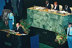 The Secretary-General circulated the request among the UN membership.[3] With no objections and unanimous support, the Russian Federation took the USSR's place, with Boris Yeltsin personally taking the RF's seat at the January 31, 1992 Security Council meeting.