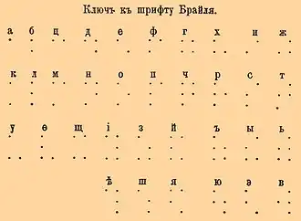 - ^ a b "РЕЛЬЕФНО-ТОЧЕЧНЫЙ ШРИФТ БРАЙЛЯ (RELIEF DOT BRAILLE FONT)" (in Russian). Archived from the original on 2012-06-16.