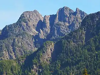 The history of the formation of the Cascade Mountains dates back millions of years ago to the late Eocene Epoch.[4] During the Pleistocene period dating back over two million years ago, glaciation advancing and retreating repeatedly scoured the landscape leaving deposits of rock debris.[4] The last glacial retreat in the area began about 14,000 years ago and was north of the Canada–US border by 10,000 years ago.[4] The U-shaped cross section of the river valleys is a result of that recent glaciation. Uplift and faulting in combination with glaciation have been the dominant processes which have created the tall peaks and deep valleys of the Cascade Range.