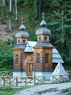 The Russian camp was located roughly halfway up the slope of Vršič. The prisoners built a small wooden chapel for their religious needs that was completed in 1915 or at the latest in January 1916.[3] The building is of typical Russian design, with two small towers on either side of the nave. There is a grave of the war prisoner Peter Polowchev next to the chapel and a pyramid-shaped tomb of unknown POWs immediately to the right of it, with the Cyrillic inscription reading "To the sons of Russia". The tomb is work by the master builder Josip Slavec from 1937–1938.[4]