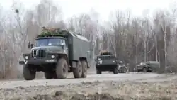 The Russian Kyiv convoy was a column of Russian military vehicles stretching some 64 kilometres (40 mi) in Kyiv Oblast from Prybirsk to Hostomel via Ivankiv[1] involved in the Russian invasion of Ukraine beginning on 24 February 2022. It initially threatened Kyiv, but then halted for reasons that remain unclear. Commentators have suggested that the large number of soldiers and vehicles may have had issues with fuel and food shortages, and may have also been delayed by attacks from the Ukrainian military.[2][3][4]