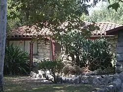 A satellite of Russian Village is the present-day Cask 'n Cleaver[11] restaurant in Cucamonga, originally an orchard house[12] designed and built by Stys. Adjacent and north of the Cask 'n Cleaver buildings, a low-lying stone wall and seven redwood bungalows,[13][14] built by Stys, and made from lumber recovered from wreckage in the Long Beach earthquake were demolished for the new Los Amigos city park,[15][16] reusing lumber for a shade structure, and river rocks to ornate some structures. Rancho Cucamonga Redevelopment Agency was awarded a Proposition 84 grant in 2011, acquired the property, construction began in March 2016, and opened in Spring 2017.[17][18][19]