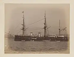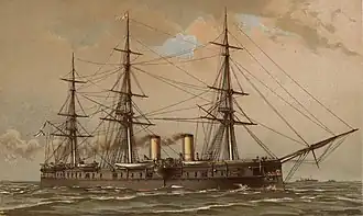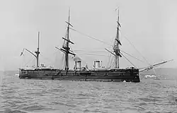 The ship's waterline belt was composed of compound armour and extended the full length of the ship. It was six inches thick amidships, but reduced to 4.5 inches (114 mm) at the ship's ends. It extended 2 feet (0.6 m) above the waterline and 5 feet (1.5 m) below.[2] Transverse bulkheads 3–4 inches (76–102 mm) thick protected the guns in the battery from raking fire. The sponsons of the 8-inch guns were equally thick.[3] The protective deck was 0.5-inch (13 mm) thick.[2]