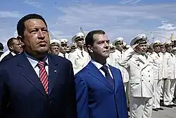 Venezuelan President Hugo Chavez and Russian President Dmitry Medvedev on board Admiral Chabanenko in 2008.