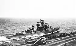 Komsomolets Ukrainy was laid down on 15 September 1959, and launched on 31 December 1960 by Mykolayiv Shipyard in Mykolayiv. She was commissioned on 31 December 1962. On February 19, 1966, she was awarded the USSR Navy Prize and a diploma of the Commander-in-Chief of the USSR Navy. From June 5 to June 30, 1967, the ship performed combat missions to assist the armed forces of Egypt (during the Arab-Israeli conflict), as part of the 5th Squadron of the USSR Navy.[6][7] From April to May 1970, Komsomolets Ukrainy participated in the maneuvers paid an official visit to Algeria from May 8 to 13. On August 30, 1974, during an explosion and fire at the Otvazhny shipyard, the sailors of Komsomolets Ukrainy provided assistance, and later took part in the investigation of the incident.[8]
